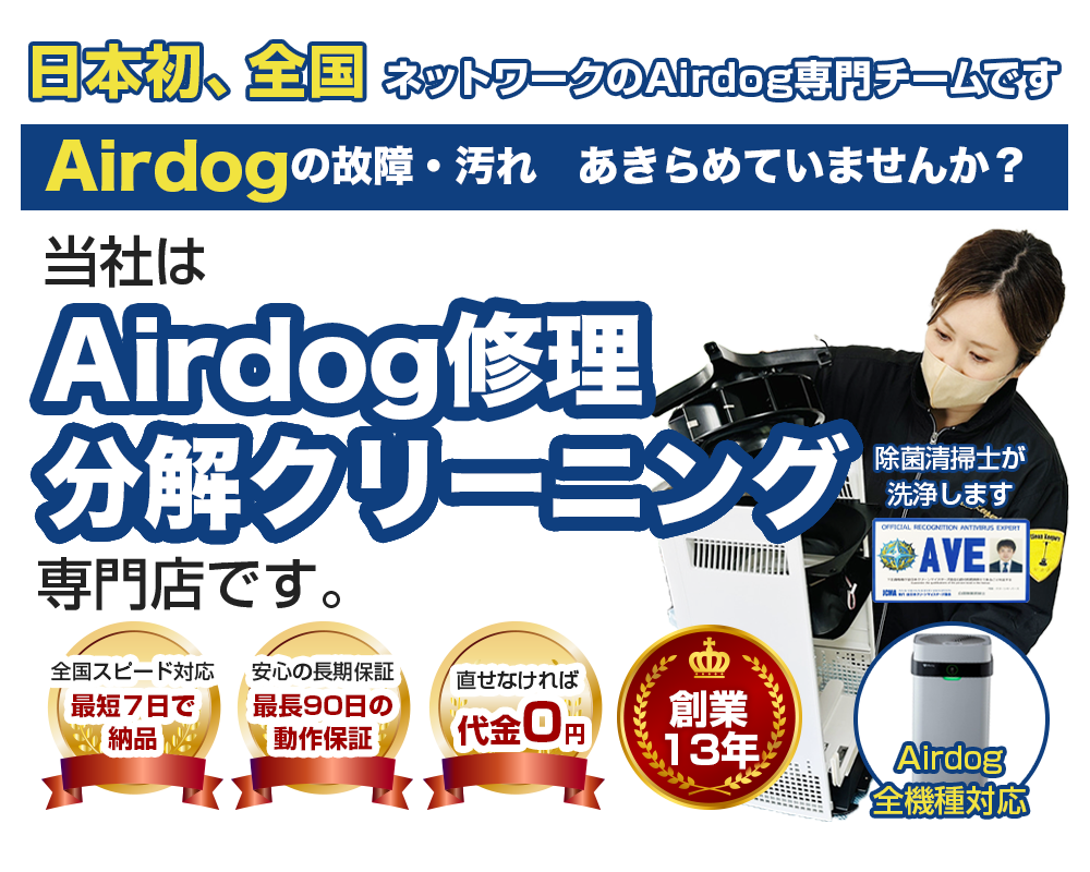 電源が入らない、ファンが動かない、パチパチと音がする、ニオイや汚れが取れない——そんなAirdogの不調、諦めないでください。当社は、Airdogに特化した修理と完全分解クリーニングの専門店です。