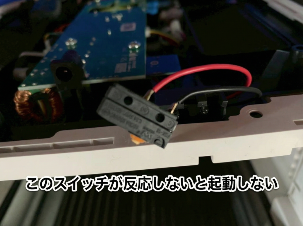 この場合、単純な電源不良ではなく、内部の接触不良やスイッチ系統の不具合が原因となっているケースが多く見られます。特に多いのが、カバースイッチの不良による通電不良です。