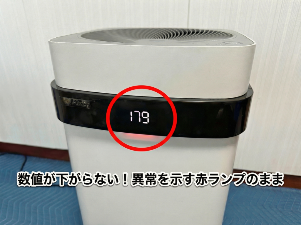 空気の数値が下がらない、常に高い数値を示す、赤ランプが消えないといった症状も多く見られます。